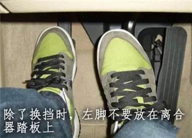 左脚要一直放在离合,相信没有教练这么教过的。实际上,教练教学员的方法是这样的。在起步、换挡的时候离合器要踩到底,不要半踩离合。如果车速低于一挡怠速转速,可以使用离合半联动方式控制车速。其它时候,左脚不要放在离合器踏板上。