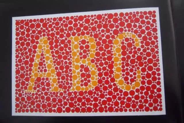 第3张色盲检测图,很明显了,它的一个背景颜色和上面的三个字母只由两个颜色组成。并且全部都是小圆点儿,三个字母ABC是用橘黄色组合而成的。视力没问题的人,都能够第一眼看到上面有三个字母ABC,但是色盲朋友看来都是非常的模糊的,识别红色对他们来说都有一定难度。不知道你们有没有看到上面的三个字母呢?